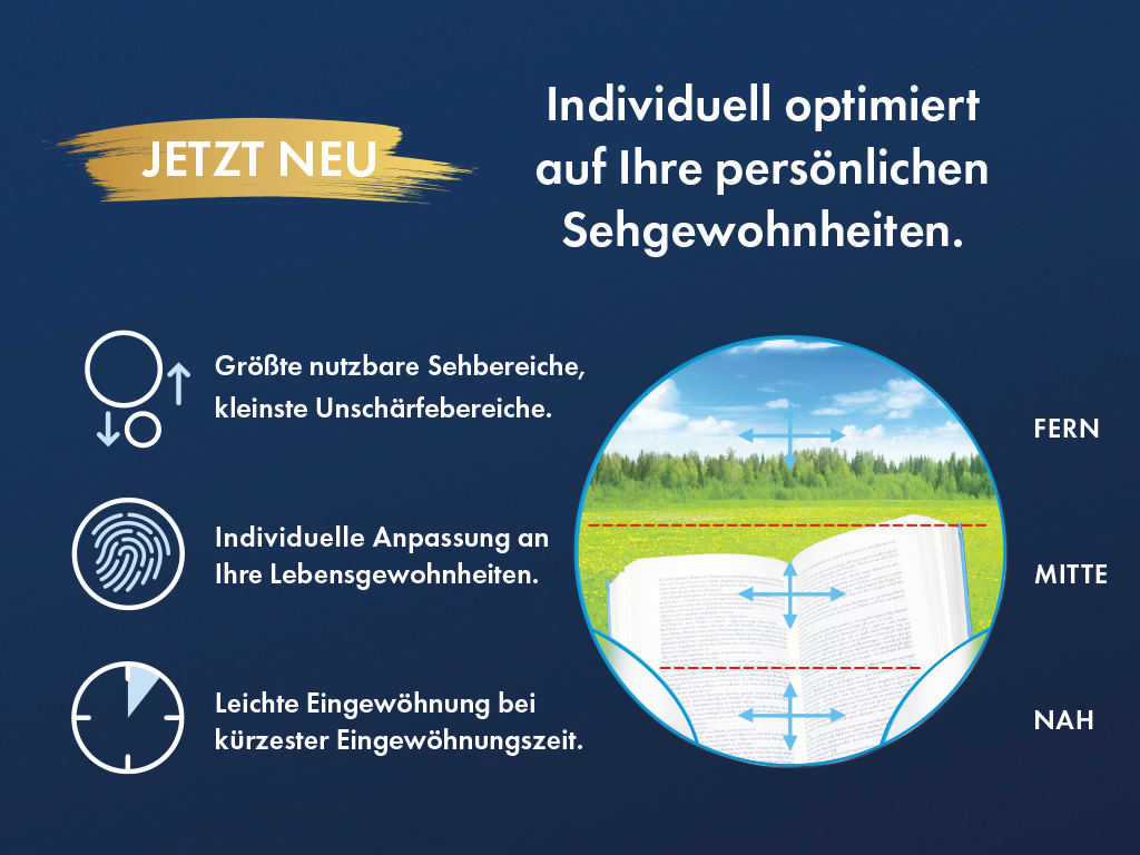 Die bedeutendsten Innovationen bei Gleitsichtgläsern finden Sie bei DELKER, z.B. das neue G100 – individuell optimierte Gläser, die präzise auf Ihre persönlichen Sehgewohnheiten und Blickbewegungen abgestimmt werden. Intelligente Designs vergrößern die nutzbaren Sehbereiche erheblich und minimieren Verzerrungen. Das Ergebnis: spontanere Verträglichkeit und natürlicheres Sehen in allen Entfernungen – ein echter Gewinn an Lebensqualität in Ihrem Alltag.